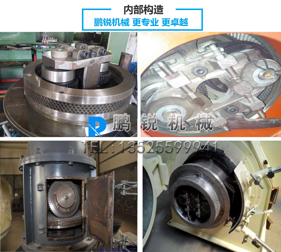 平模顆粒機型采用皮帶及蝸輪蝸桿兩級傳動,轉動平穩、噪聲低、喂料依靠物料自身的重力,避免堵塞、主軸的轉速約為60rpm,壓輥的線速度約為2.5m/s,可有效去除物料中的氣體,增加了產品的緊密程度。